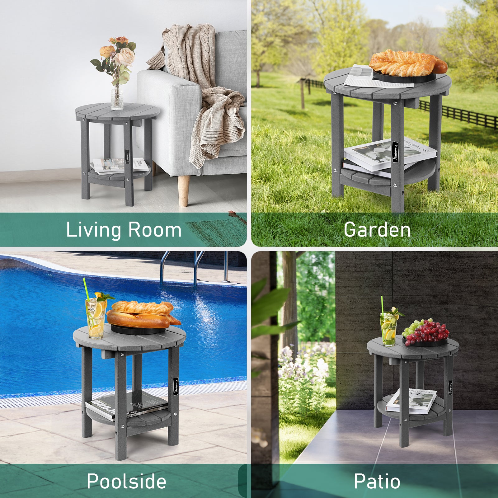 - Double Layers & Smooth Design: The 2-tier design of this outdoor side table provides more storage space for food, drinks, books and other items. The smooth edge design makes this patio table more safe especially for families with children. This patio side table is an ideal companion for Adirondack chairs, Rocking chairs and Chaise Lounge chairs.