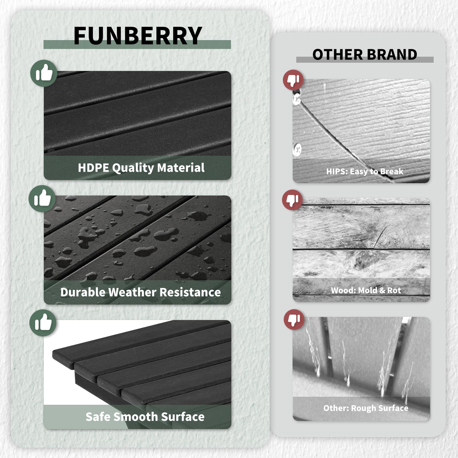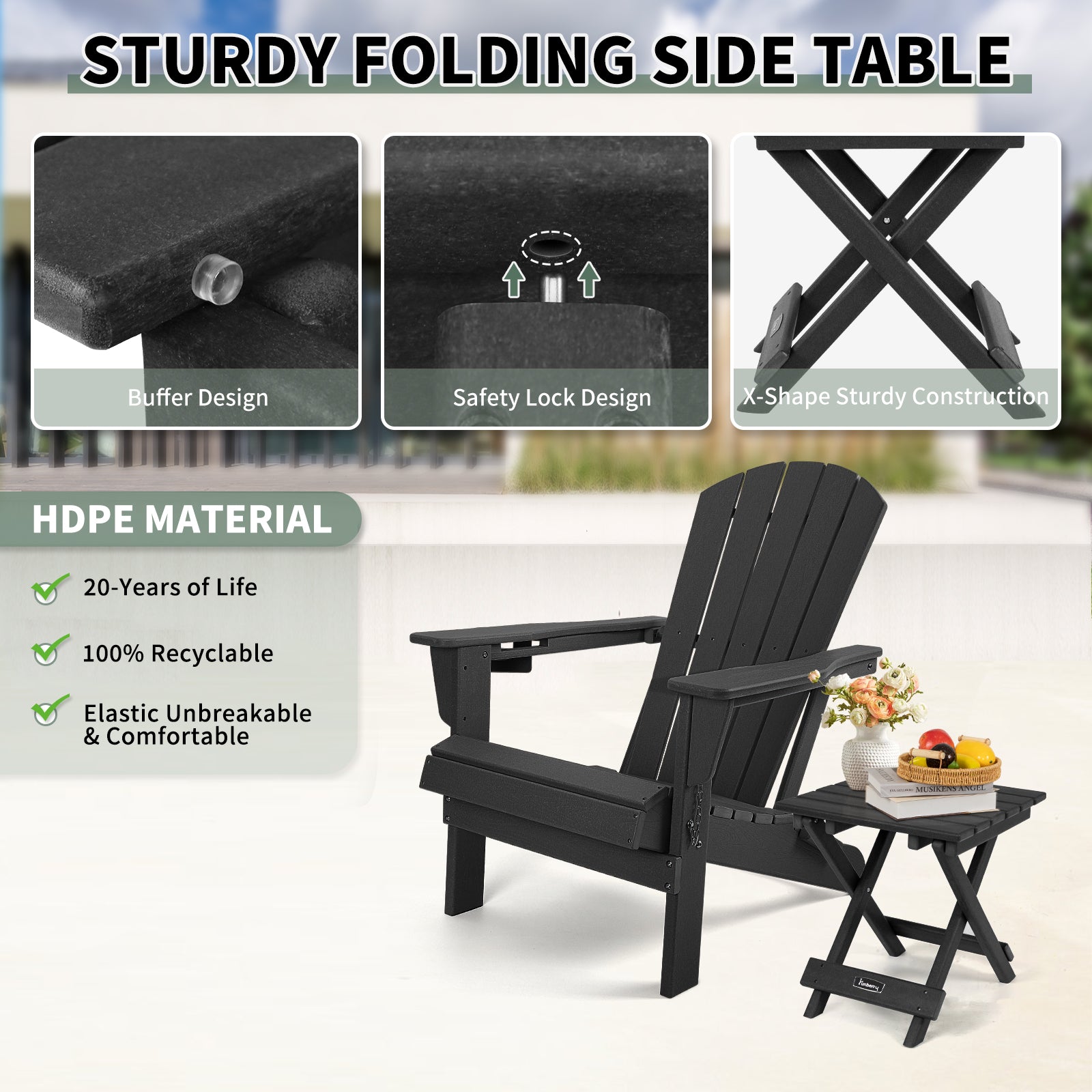 - Weather Resistant Durable Material: This Adirondack side table is made of HDPE (High Density Polyethylene) material, which makes it highly durable. This side table can withstand extreme climates without fading, cracking or rotting comparing to other materials like wood or plastic. This patio side table is waterproof, heat resistant and UV fade resistant.