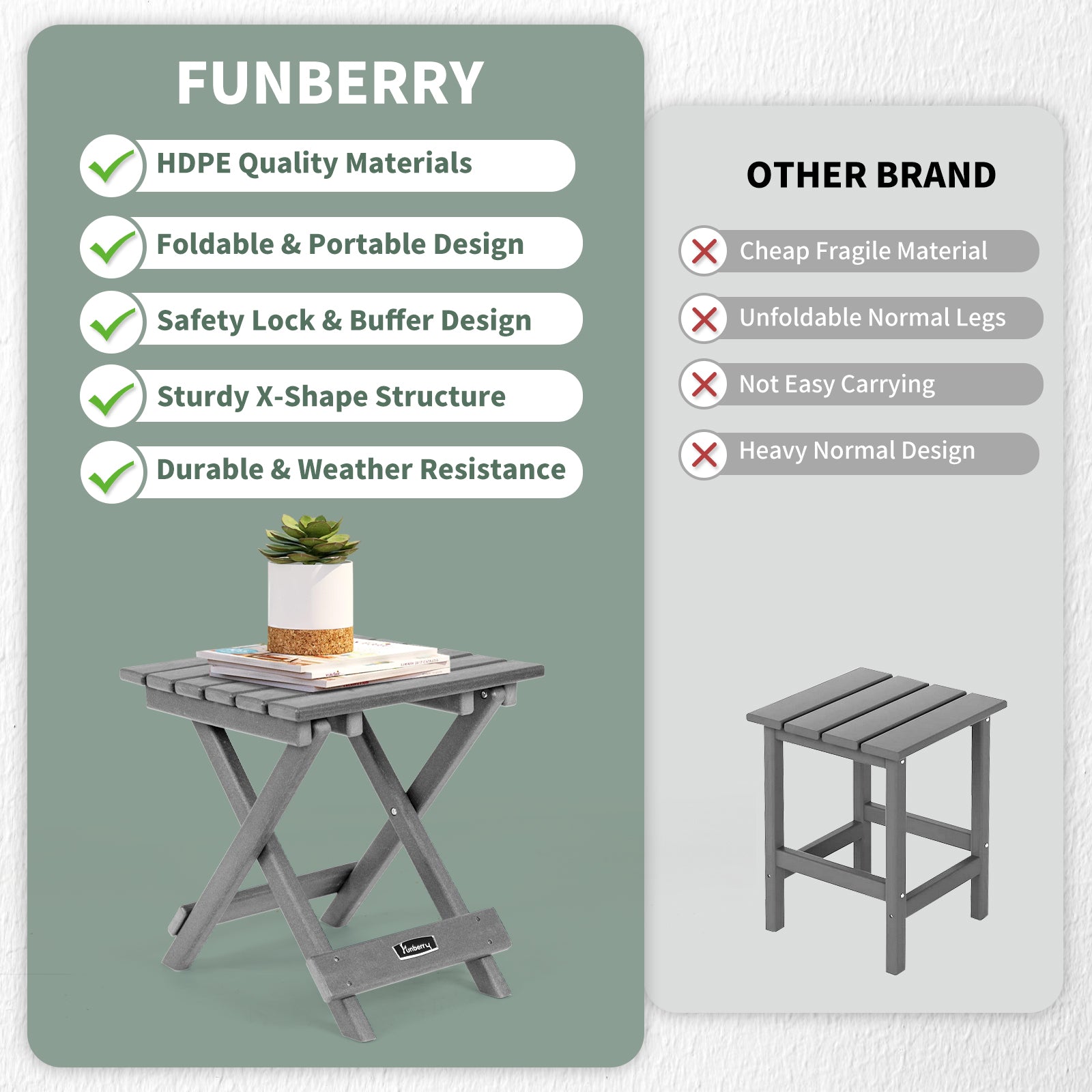 - No Assembly & Safety Lock & Buffer Design: This outdoor side table requires No Assembly, simply unfold it for use and quickly fold it flat for storage. This side table has the Safety Lock to prevent it from falling apart when unfolded for use, and a Buffer design for anti-collision in the middle of the table top, its X-shape legs make it very steady even when loading things.