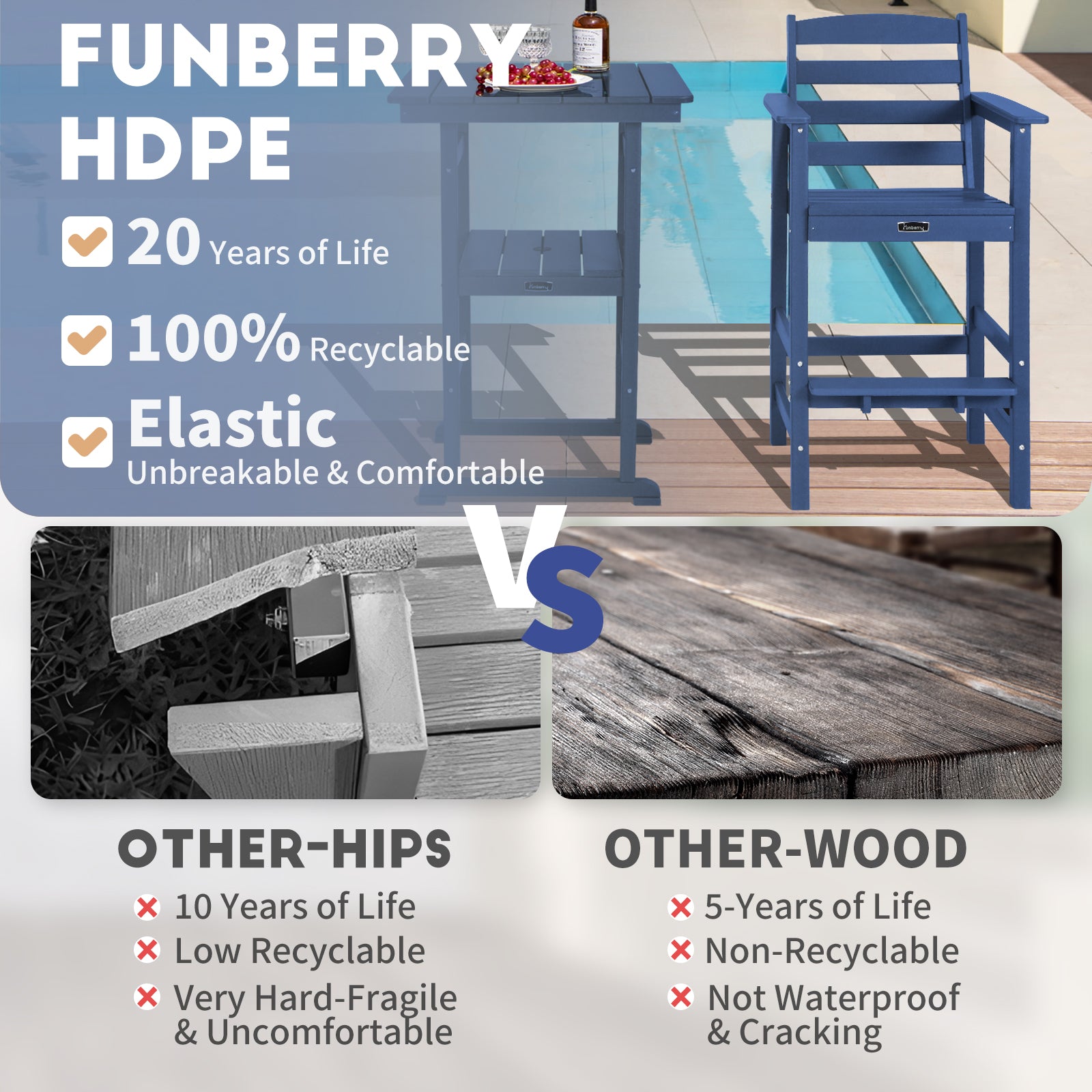 - All-Weather Durability: Made from eco-friendly HDPE, this Adirondack bar set is waterproof, heat-resistant, and UV-resistant. The bar height outdoor table and chairs withstand harsh conditions like intense sun, heavy snow, rain, salt spray, and coastal winds.